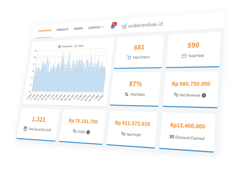 Kelola orderan, produk, customer, pengiriman, sampai laporan dalam satu aplikasi